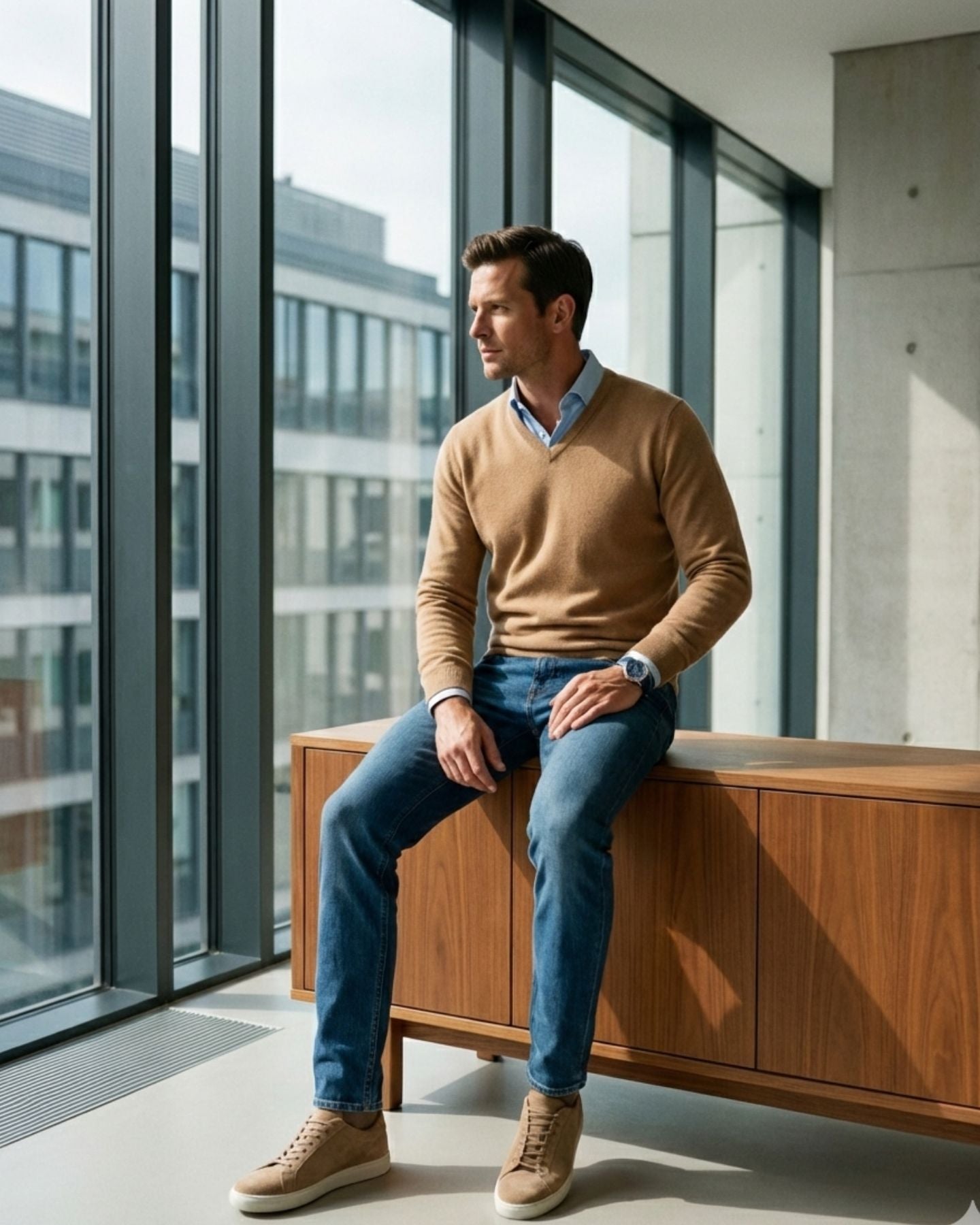 Ein klassischer V-Ausschnitt-Pullover aus reinem Kaschmir – elegant, weich und vielseitig. Er lässt sich perfekt über einem Hemd tragen und verleiht Business- wie Freizeitlooks eine kultivierte Note. Die feine Strickstruktur schenkt Leichtigkeit, während das edle Material Wärme und Komfort garantiert. Ein zeitloses Essential für gepflegte Garderoben. Die Farbe „Sand“ verkörpert natürliche Leichtigkeit und eine subtile Wärme. Sie harmoniert hervorragend mit Weiß, Marineblau und Braun.