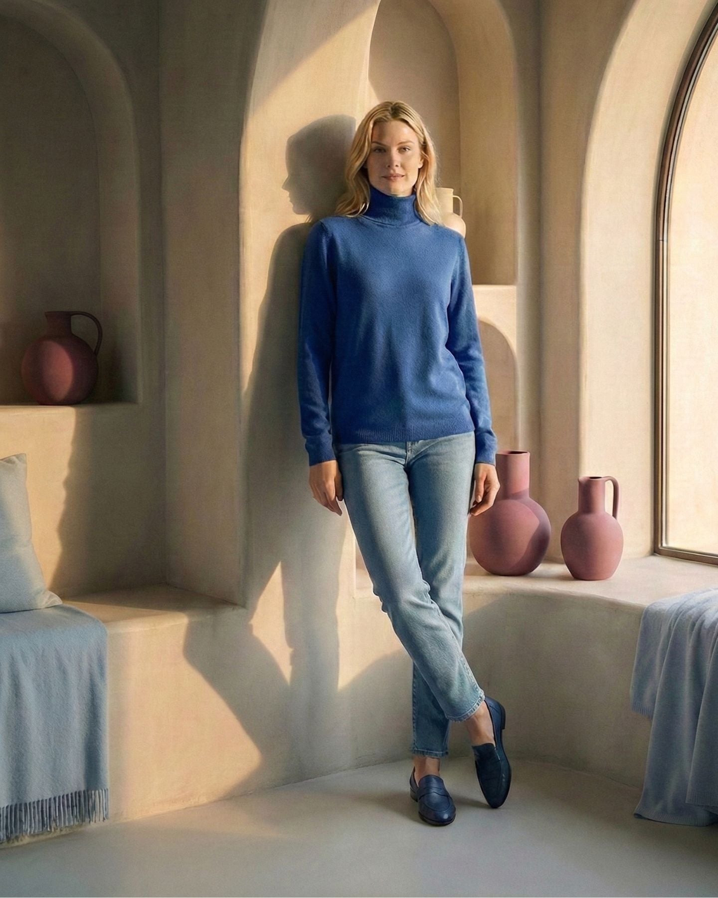 Ein klassischer Rollkragenpullover aus reinem Kaschmir – weich, warm und universell einsetzbar. Das Modell zählt zu unseren Bestsellern und überzeugt durch elegante Vielseitigkeit: getragen solo, unter einem Sakko oder kombiniert mit legeren Outfits. Die klare Silhouette und die luxuriöse Faserqualität machen ihn zum unverzichtbaren Essential. Die Farbe „Azurblau“ bringt frische Klarheit und eine leichte Brillanz in jedes Outfit. Sie wirkt modern, belebend und eignet sich hervorragend in Kombination mit Dunkelgrau, Weiß und Olivgrün.